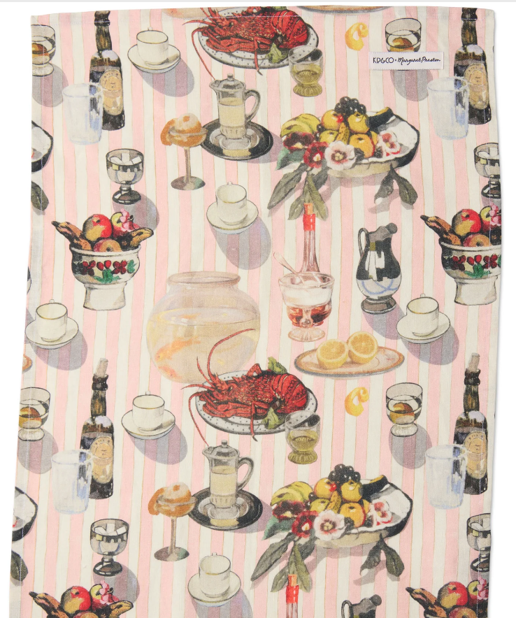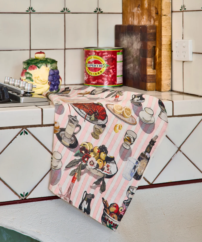 The Kip & Co x Margaret Preston Still Life Tea Towel is a burst of colour for your kitchen. Made from a soft, durable linen-cotton blend, this towel features dreamy still life scenes of hand-painted tableware set against a striped pink-and-white base.