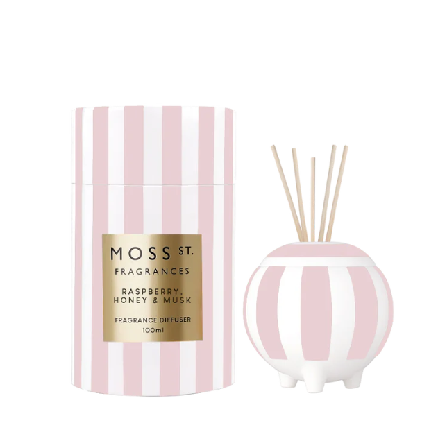 This MOSS St hand-poured, custom-designed ceramic diffuser that continuously fills your room with the scents of Raspberry, Honey & Musk. Featuring bold stripes and luxe foiling, these ceramics are designed to be re-used long after the diffuser is finished.