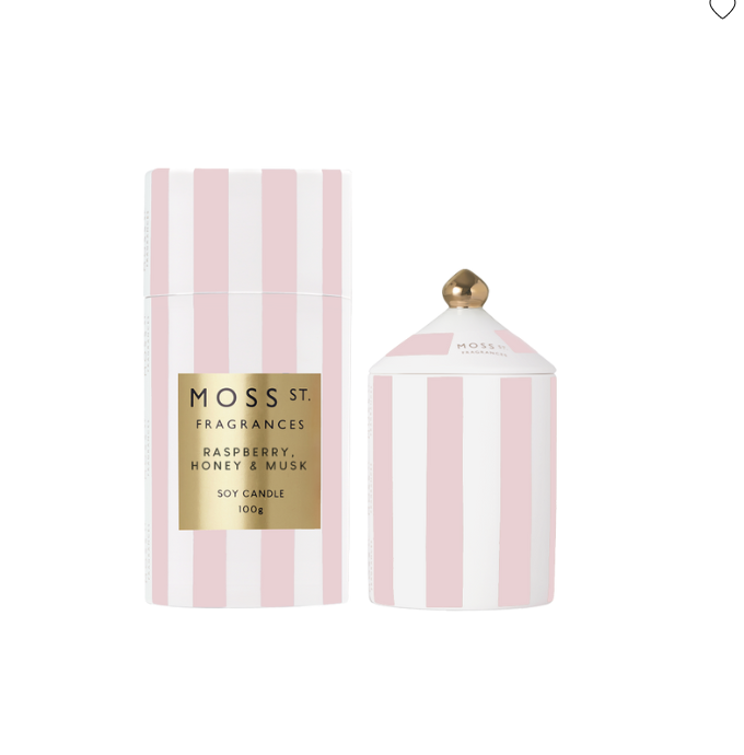 The MOSS St - hand-poured, custom-designed ceramic candle that fills any space with the light floral scent of Raspberry, Honey & Musk. Featuring bold stripes and luxe foiling, these ceramics are designed to be re-used long after the candle is finished.